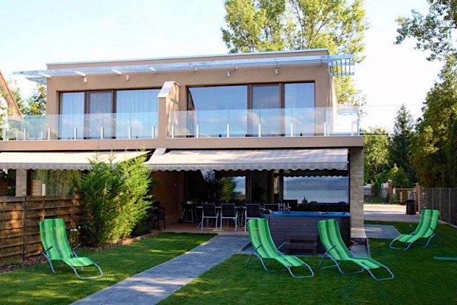 A kiadó luxusnyaraló földszintjén nagy nappali, üvegfallal és páratlan panorámával a Balatonra, kinyitható ülőgarnitúra, nagy LCD TV, házimozirendszer. A minimalista nyaraló emeletén 3 hálószoba található, a nagy háló franciaággyal, terasszal, teljes panorámával, a közepes háló franciaággyal, a kisebb háló 2 egyszemélyes ággyal berendezett.